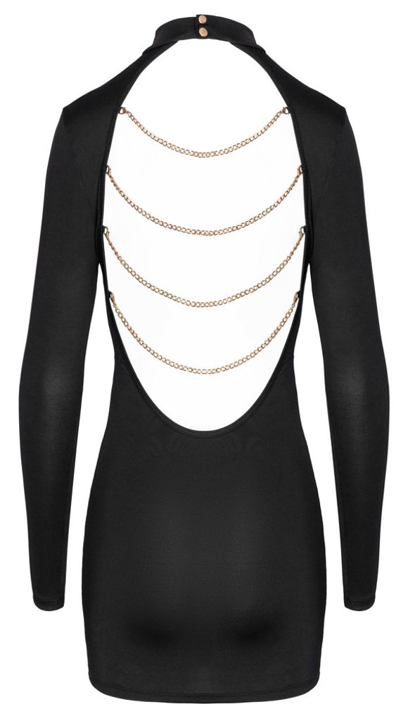 Přes odhalená záda vedou čtyři zlaté řetízky, které vytvářejí atraktivní kontrast a přitahují pozornost. Lze je snadno odepnout a přizpůsobit tak styling podle nálady.