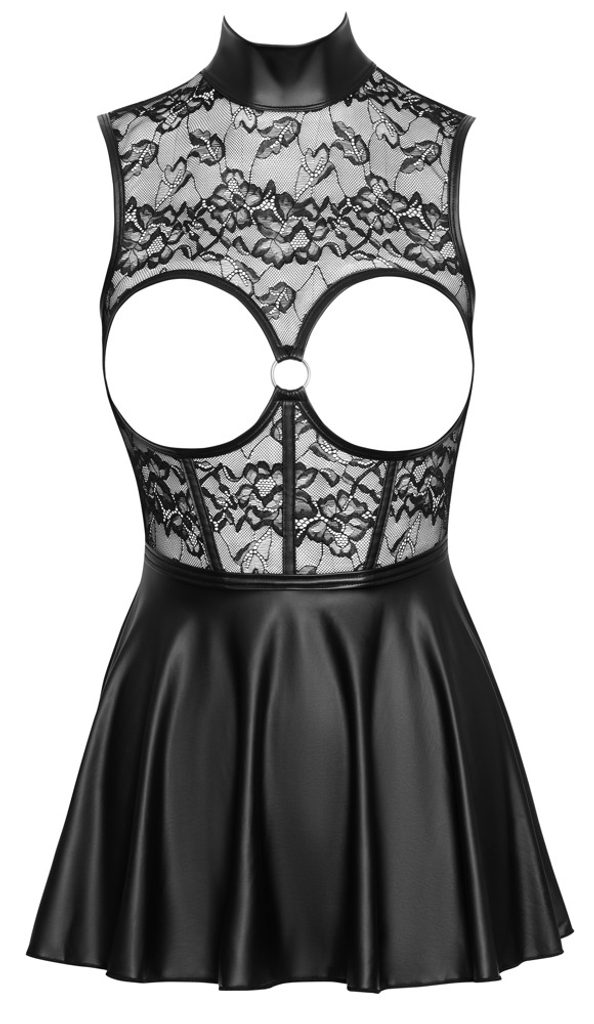 Horní část z jemné krajky přiléhá k tělu a díky tvarujícím švům krásně zvýrazňuje pas. Otevřený střih nechává vyniknout poprsí, které je orámované matnými prvky a doplněné o výrazný stříbrný kroužek.